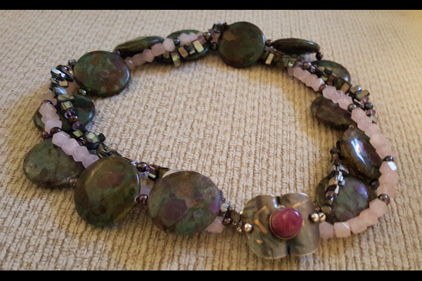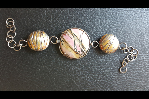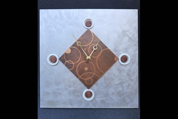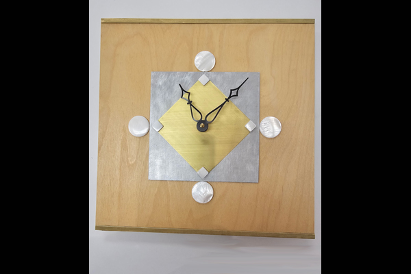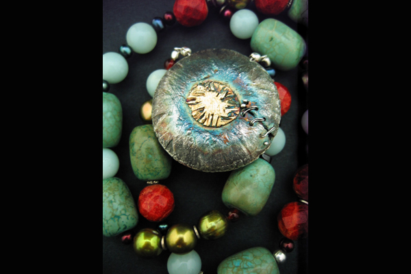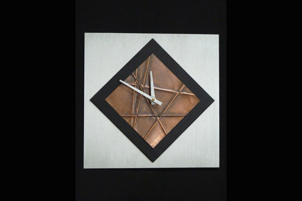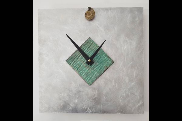 I use a mix of metals to fabricate my jewelry and my clocks. I hand texture the metals and apply different patinas to add contrast and color. I employ many different traditional jewelry techniques such as roller printing, corrugating, stamping, fold forming, enameling and hydraulic press forming to create further interest. You can see my jeweler’s influence through the embellishments such as gem stones, pearls and shell on both mediums.